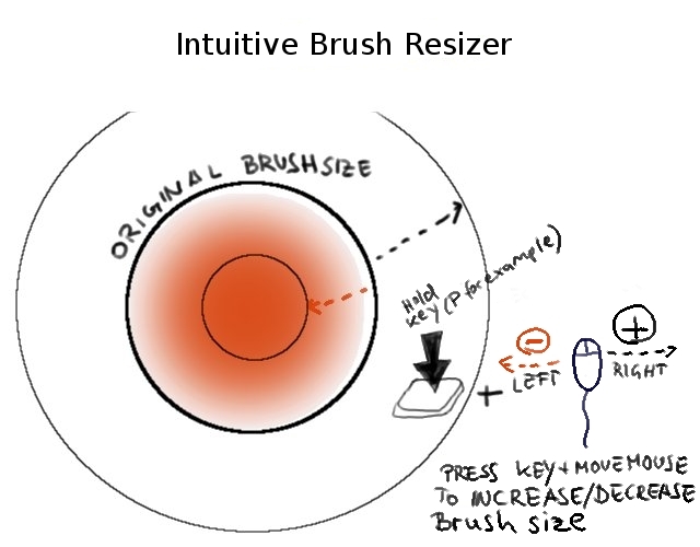 Link to short movie: https://youtu.be/wOGBDRWpgOsIn part, the graphic tablets, do it... but is impossible to resolve the scale range. To have the possibility helps the artist to have on-the-fly different range scales is better.In 2014 I had a short thread with Alexia and the focus around the Size was the possibility to have a range (min and max) in the UI. This is another thing interesting... but this signify also to have the presets and not necessarily this resolve all artists' tasks.To have a feature to scale dynamically the Size is interesting to avoid, for example, sets of brushes thought to different size ranges; a fast way to control range sizes with graphical tablets, etc...Here is a plug in that does what you are looking for. I agree that this would be a nice feature to have come with GIMP. There have been a few brainstorm pages over the years about this topics here, here, here, here, and here. I don't know if there is a feature request in bugzilla though.The plugin does not work in GIMP 2.9 as the function it uses is deprecated. I am unable to log into the plugin registry or I would report the bug I am having. Here is the error I am getting.WARNING: Plug-In "dynamic_brush_resize.py"(/home/andrew/.config/GIMP/2.9/plug-ins/dynamic_brush_resize.py)called deprecated procedure 'gimp-brushes-get-spacing'.It should call 'gimp-brush-get-spacing' instead!